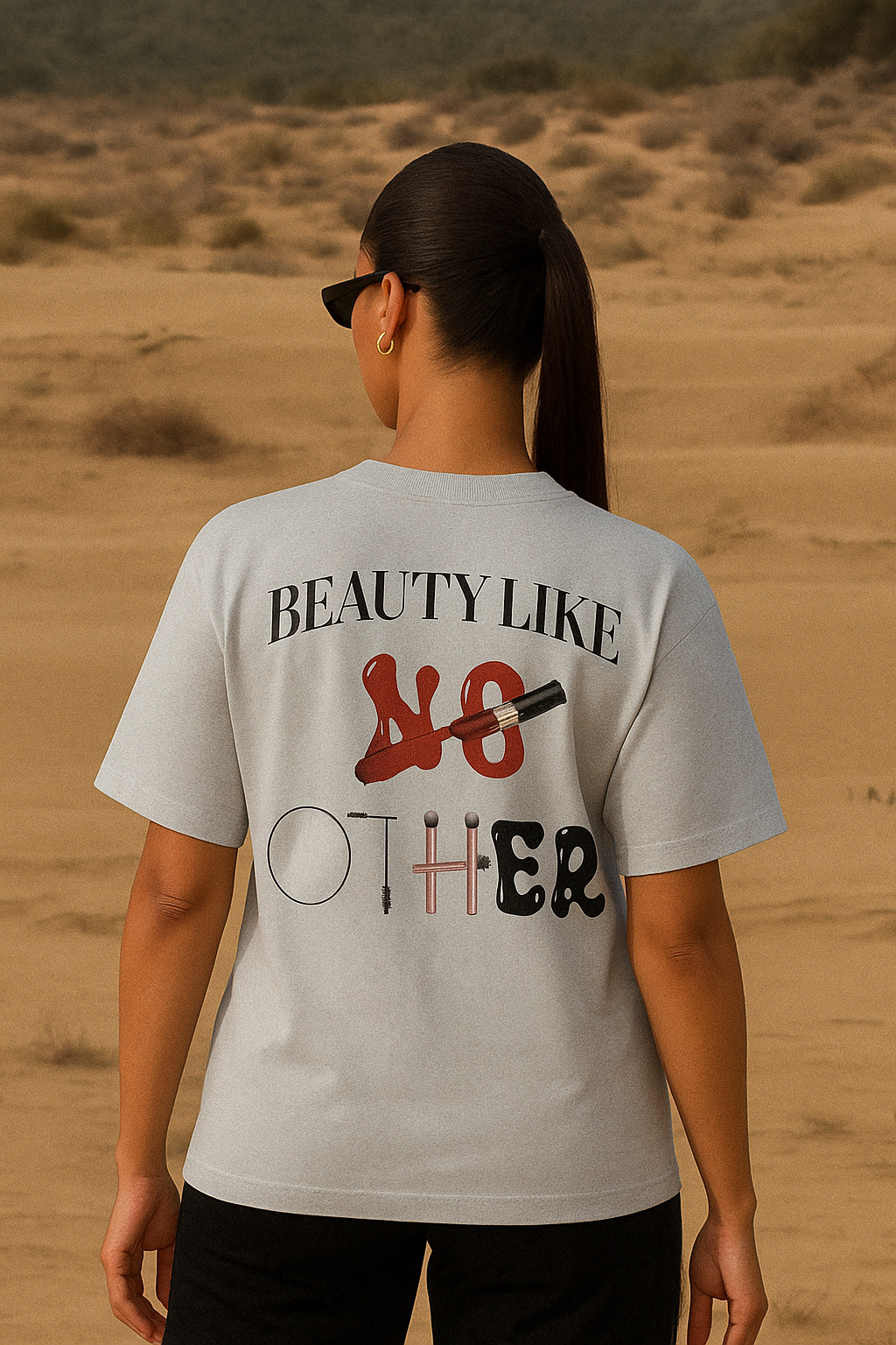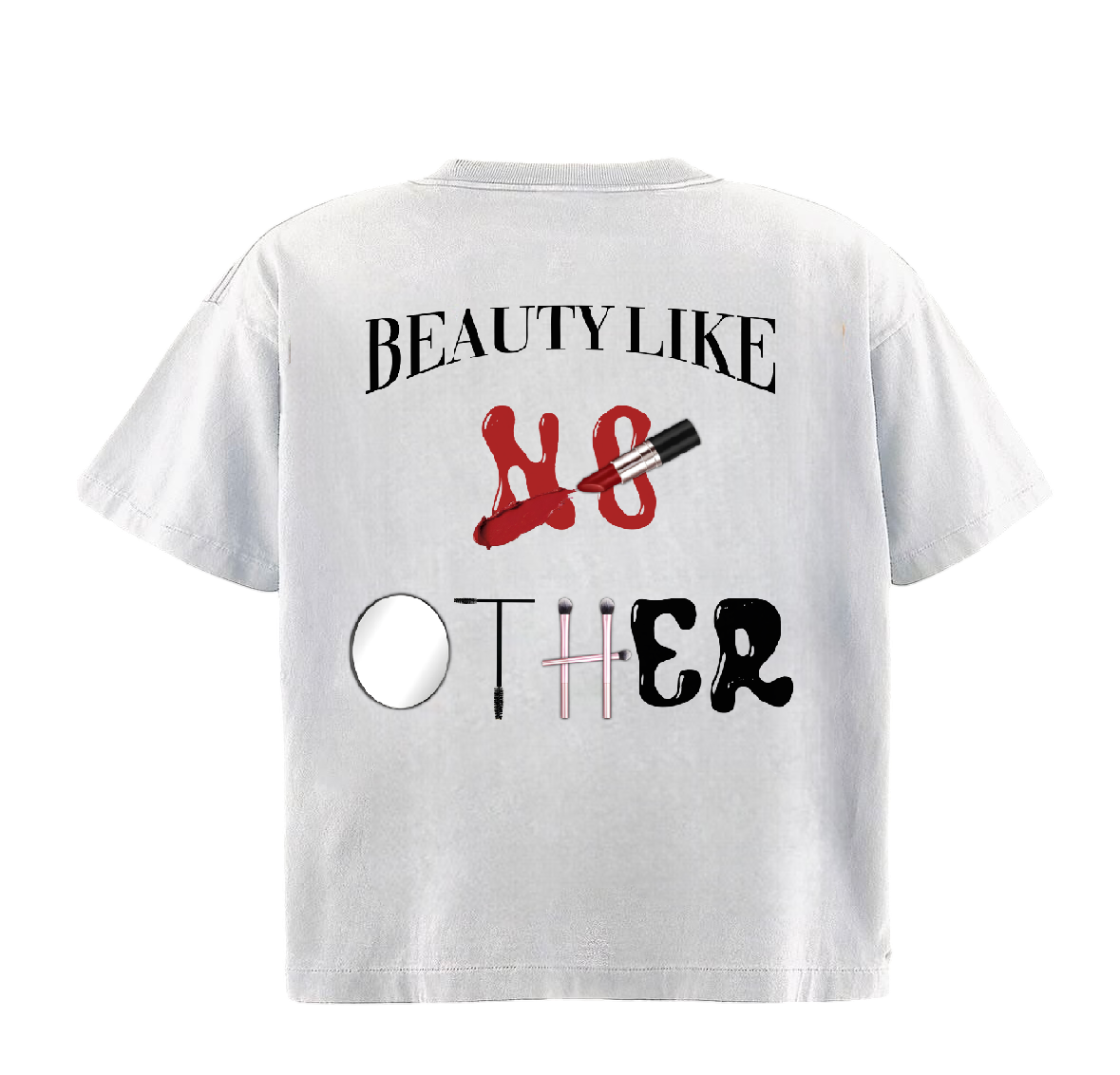 The “Beauty Like No Other” Tee is for the women whose beauty can’t be copied or recreated. The graphic features symbols like a mirror, lipstick, hairbrushes, and mascara—elements that reflect self-care, confidence, and individuality. It’s a reminder that real beauty is personal, powerful, and entirely your own.