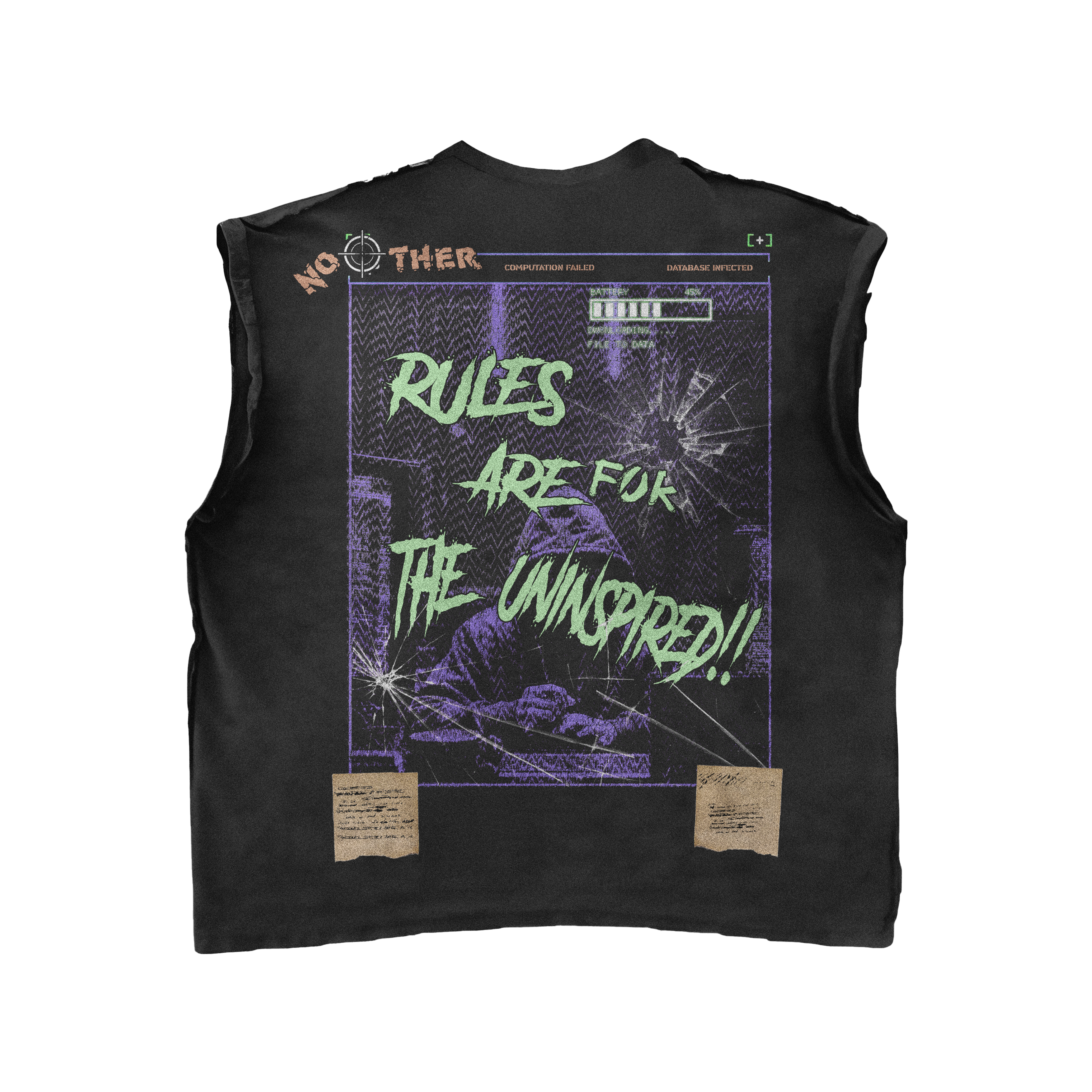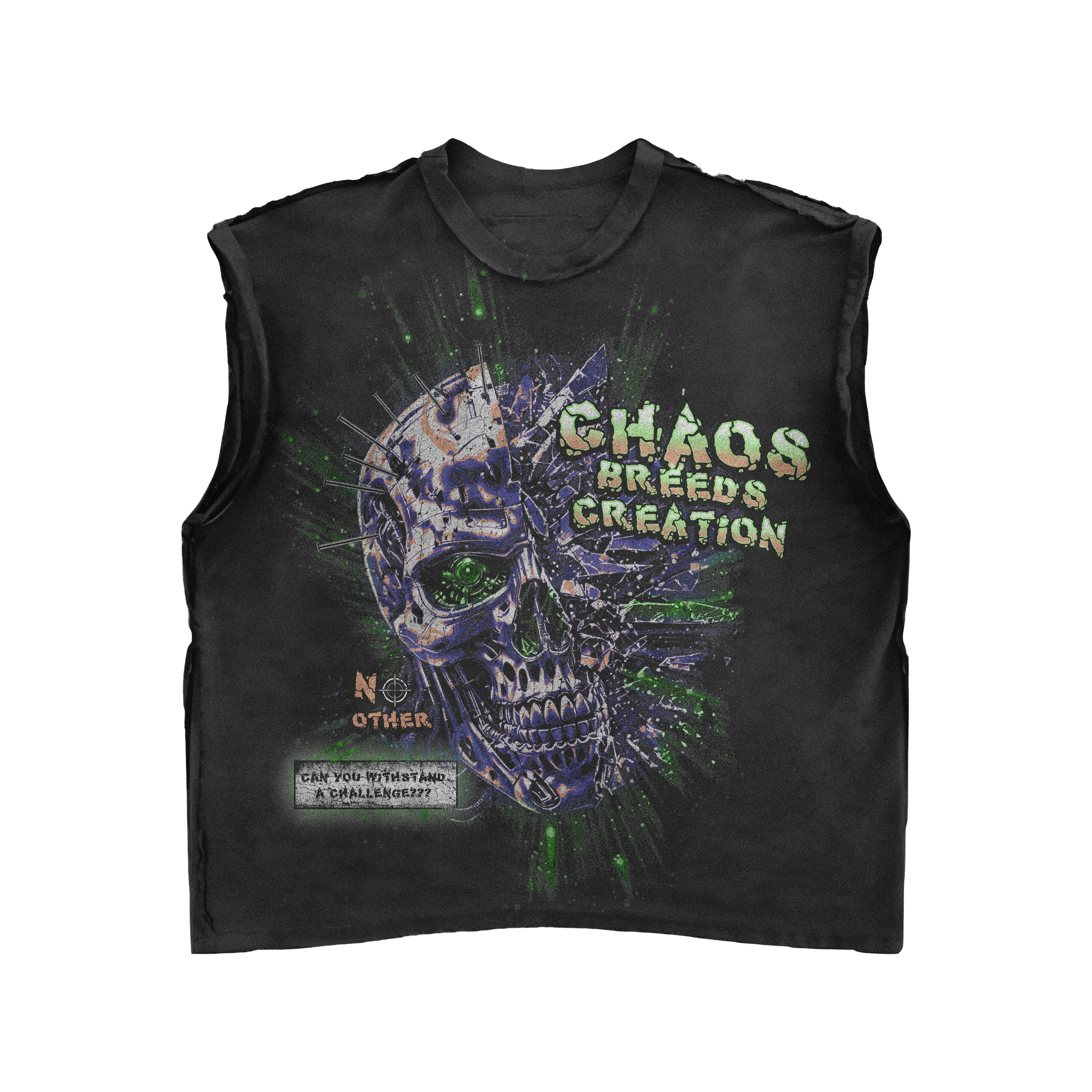 The Chaos Sleeveless Tee features a slightly oversized fit with a striking robotic face surrounded by flying debris. The front boldly declares “Chaos breeds creation,” capturing the power of making greatness from disorder. The back echoes this rebellious spirit with a shattered computer screen graphic and the statement “Rules are for the uninspired,” perfect for those who thrive on breaking molds and building their own path.
