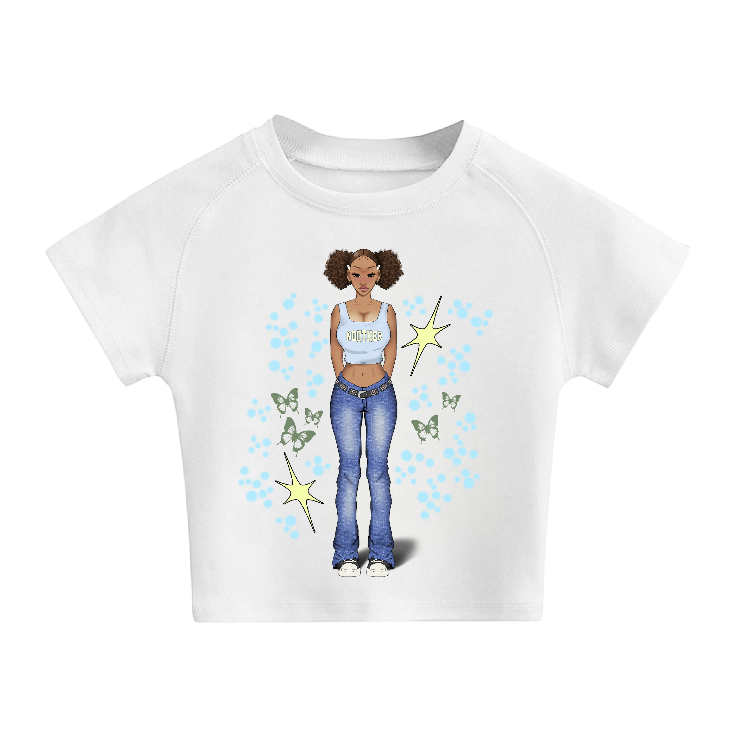 The It Girl Crop Top captures effortless style with a bold, playful vibe. Front and center is a stylish teen girl rocking a No Other crop top, clean jeans, and standout shoes—bringing main character energy to the graphic. Surrounded by butterflies, sparkle symbols, and subtle polka dots, the design pops with personality.