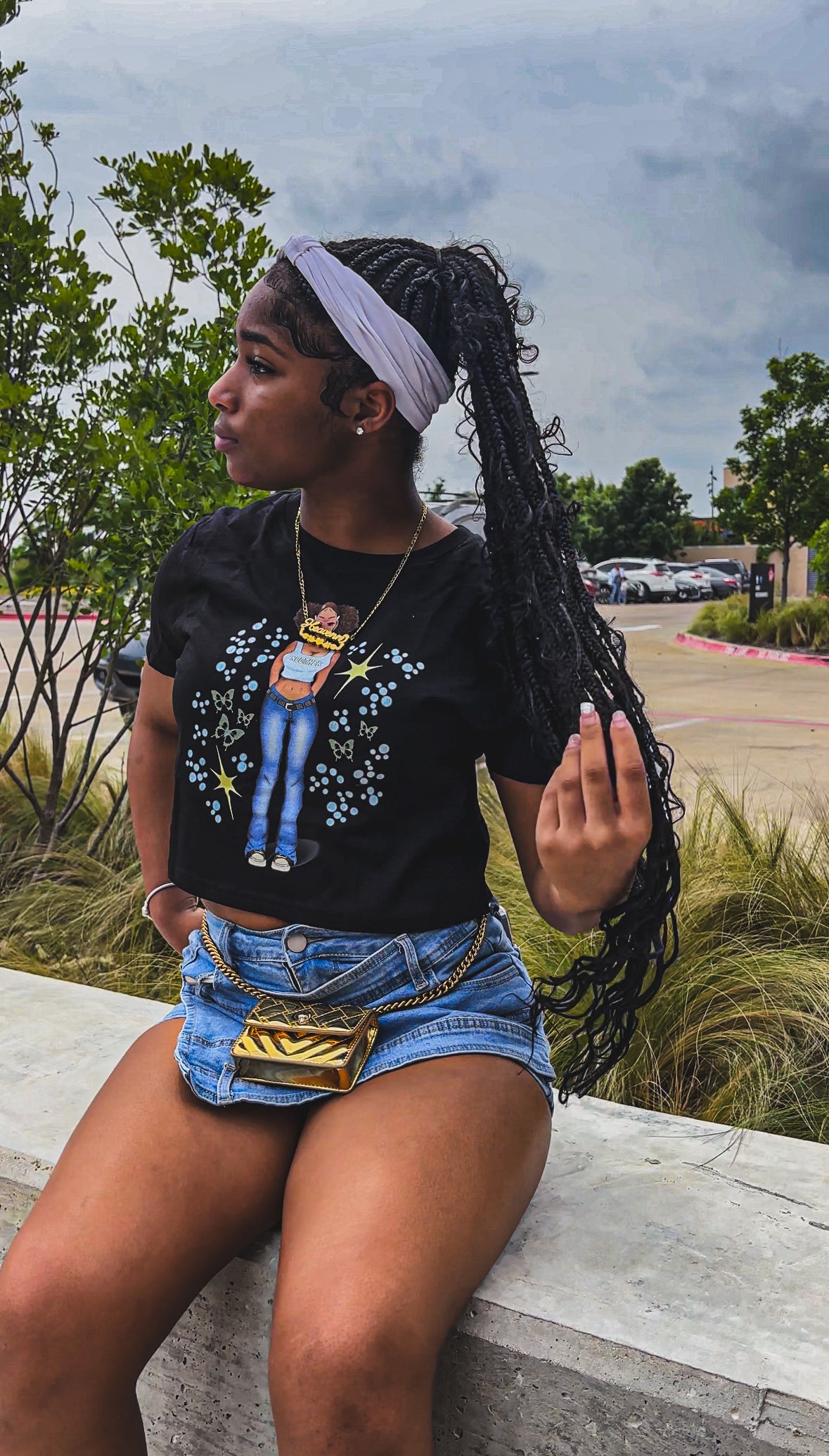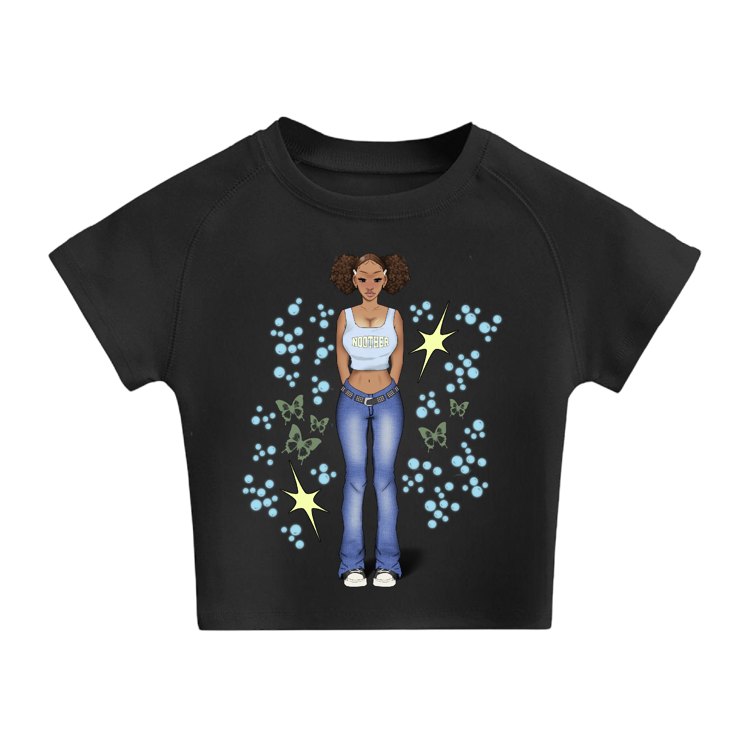 The It Girl Crop Top captures effortless style with a bold, playful vibe. Front and center is a stylish teen girl rocking a No Other crop top, clean jeans, and standout shoes—bringing main character energy to the graphic. Surrounded by butterflies, sparkle symbols, and subtle polka dots, the design pops with personality.