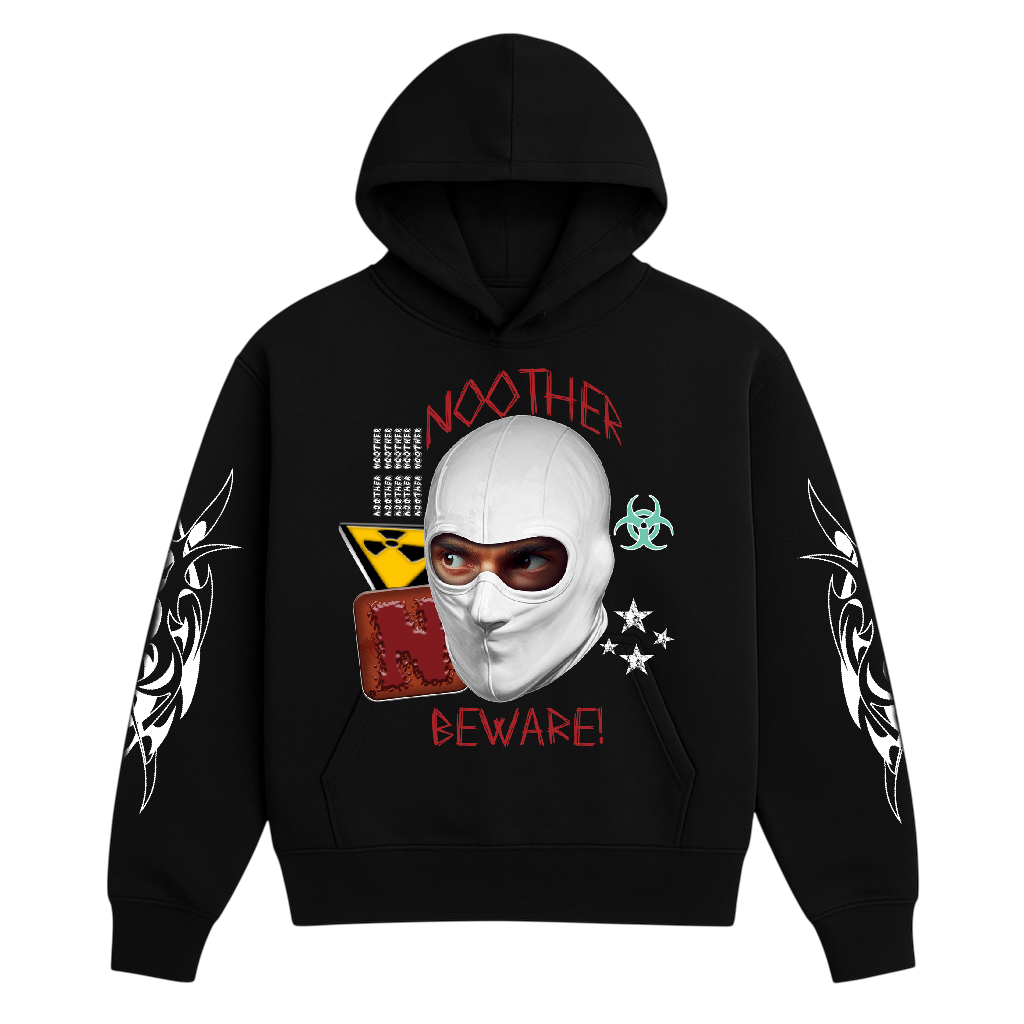 The Beware Hoodie features a slightly oversized fit and bold graphic details—a masked figure, stars, and hazard symbols collide on the front, while a sharp reminder to “stay in your own lane” is stamped across the back. Clean. Cautionary. Unapologetic.