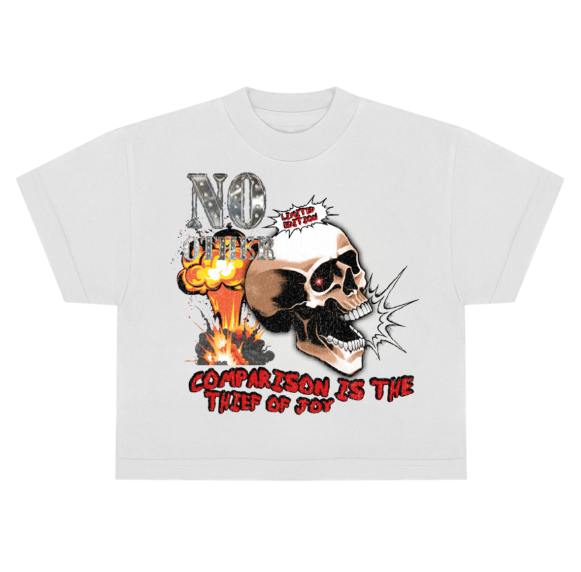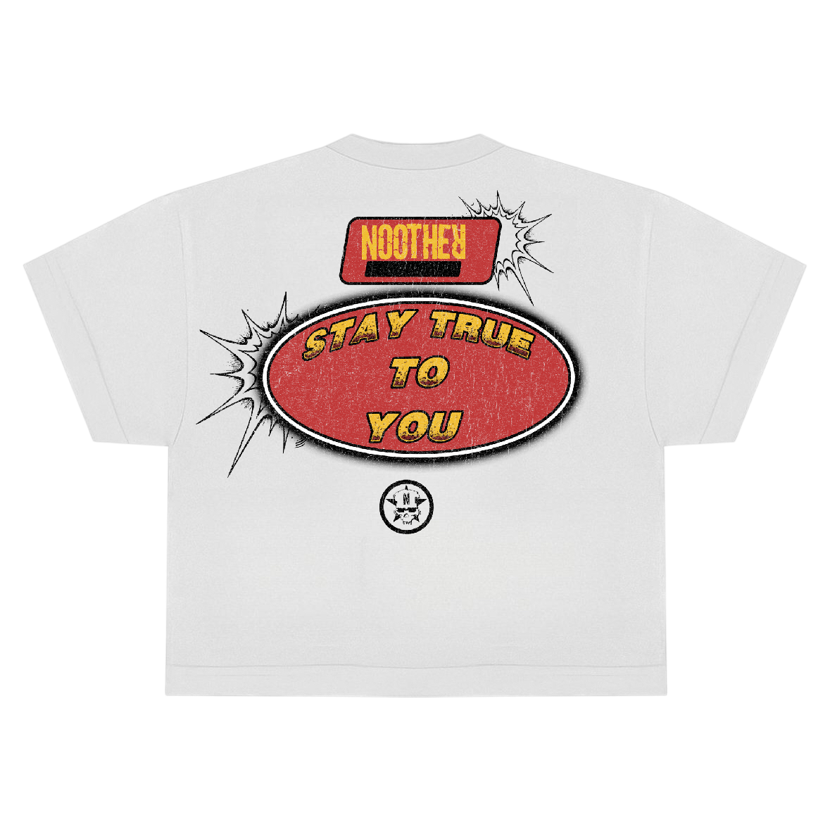 The “Stay True To You” Tee comes in a cropped, slightly oversized fit with a bold graphic that makes its message clear. The front features a skull with its mouth slightly open and an explosive backdrop, paired with the phrase “Comparison is the thief of joy”—a reminder to focus on your own path. On the back, “Stay true to you” drives it home, pushing authenticity over imitation.