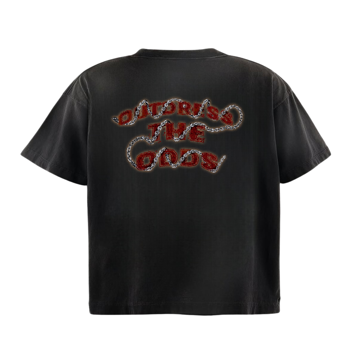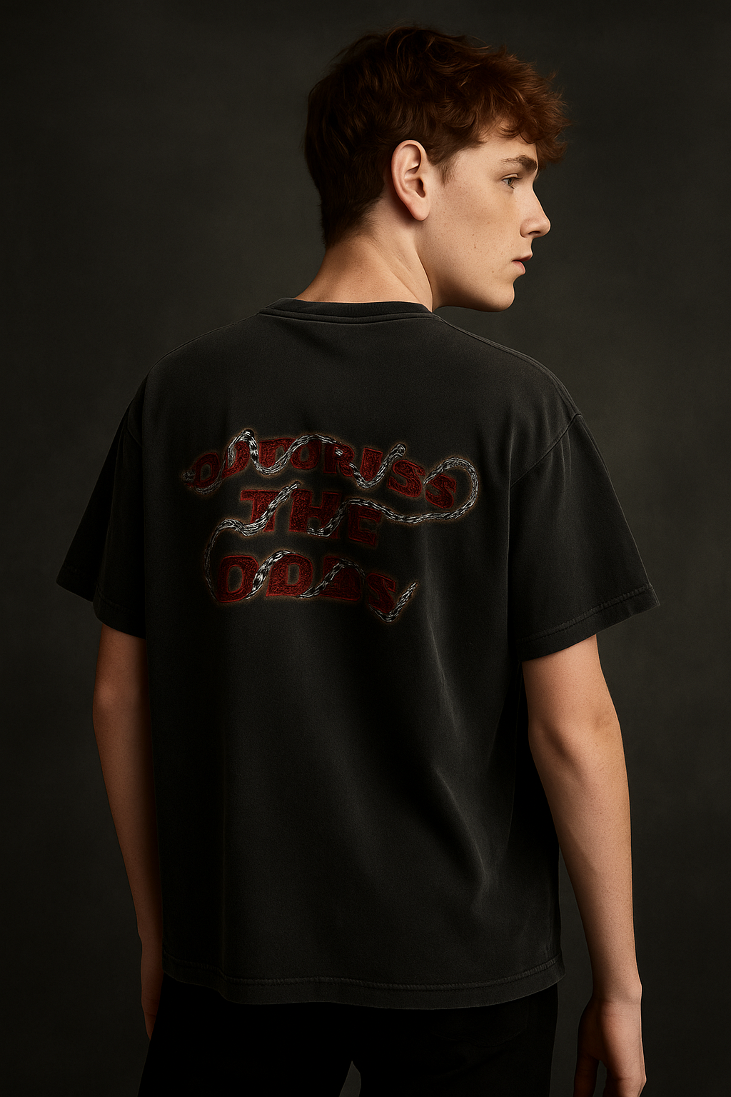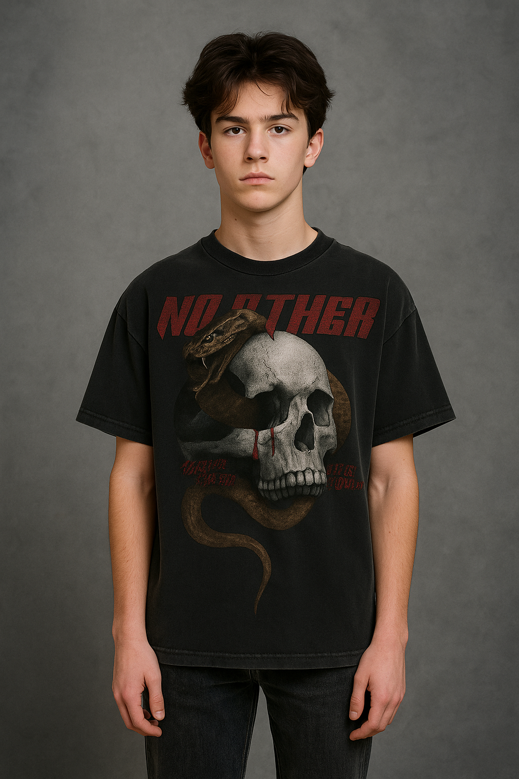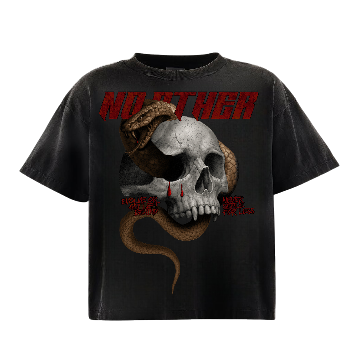 The SkullBound Tee is a statement piece with bite. A bold skull-and-snake graphic takes the front, flanked by phrases like “Never settle for less” and “Evolve or get left behind”. On the back, “Outdress the odds” sends a clear message—let your style speak louder than anything in your way.